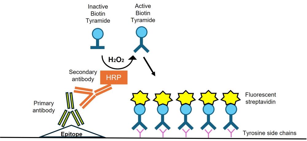 Tyramide Signal Amplification (TSA) is a technique used to amplify signals in immunofluorescence. TSA is a highly sensitive method enabling detection of low abundance proteins. TSA can easily be added into the workflow of IHC and ICC. TSA works by using a HRP conjugated secondary antibody which uses biotin tyramide as a substrate in the presence of hydrogen peroxide. Tyramide becomes activated and covalently binds to neighboring tyrosine residues, creating a dense biotin labelled region in the vicinity of the primary antibody. Fluorescently conjugated streptavidin binds with high affinity to biotin, enabling detection through immunofluorescence. TSA is also compatible with multiplexing with fluorescent secondary antibodies providing that the other antibodies used are from different species.