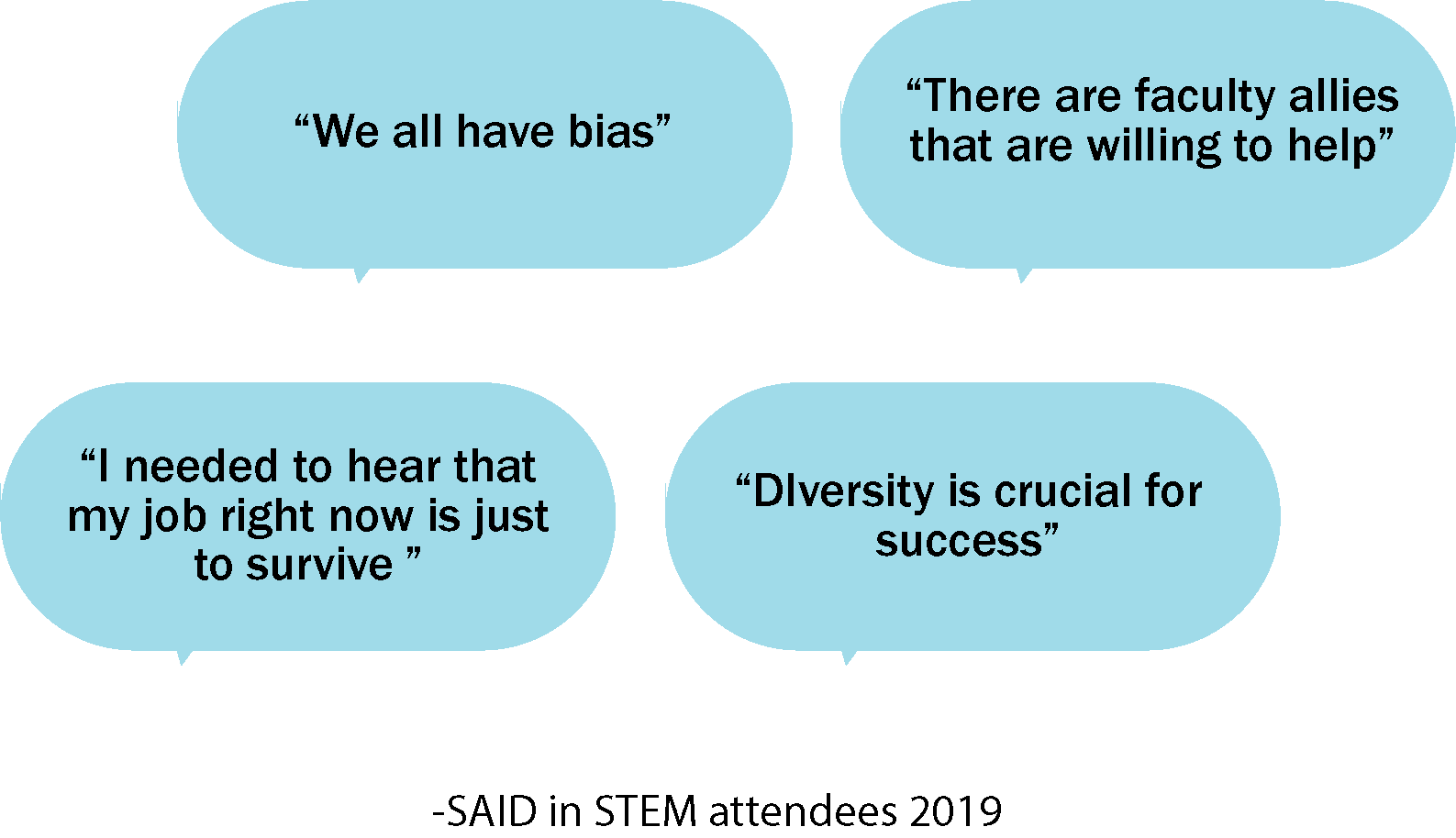 After the series ended, SAID in STEM members approached me to discuss the impact SAID in STEM had on them. One male lab technician explained: “I hope to continue the discussion SAID in STEM has reawakened as I move forward in academia and in life. Being aware of these issues is a key first step to change, but more work can, and should, always be done.”