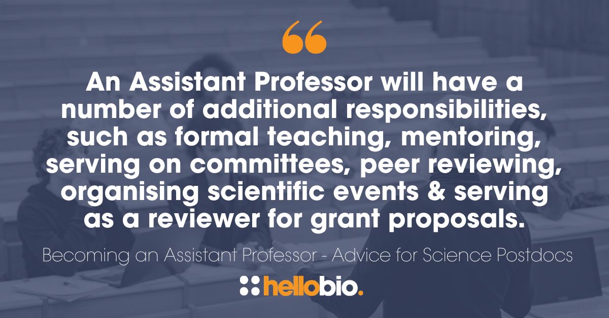 For life scientists hoping to follow a traditional academic career path, the next step beyond a postdoc role is to become an Assistant Professor. While both roles require the demonstration of extensive research skills and experience, an Assistant Professor will have a number of additional responsibilities, such as formal teaching, mentoring, serving on committees, peer reviewing, organising scientific events, or serving as a reviewer for grant proposals.