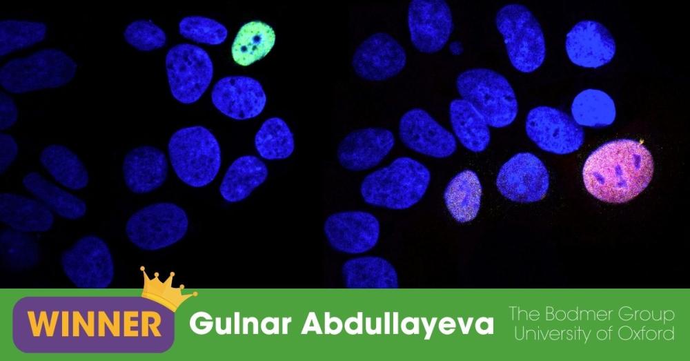 We couldn’t resist the spooky faces spotted in this brilliant image captured by Gulnar Abdullayeva, a PhD student at the University of Oxford, UK! Things got ghostly in the Cancer and Immunogenetics Lab when this image of cancer cells turned into a Halloween scene! Congratulations to Gulnar and the team at the Bodmer Group who now have a cool $250 to spend on something fun for everyone!