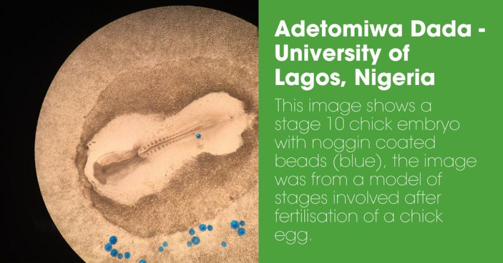 - This image shows a stage 10 chick embryo with noggin coated beads (blue), the image was from a model of stages involved after fertilisation of a chick egg. Submitted by Adetomiwa Dada of the University of Lagos, Nigeria.