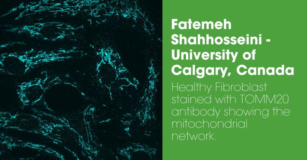 - Healthy Fibroblast stained with TOMM20 antibody showing the mitochondrial network. Submitted by Fatemeh Shahhosseini of the University of Calgary, Canada.
