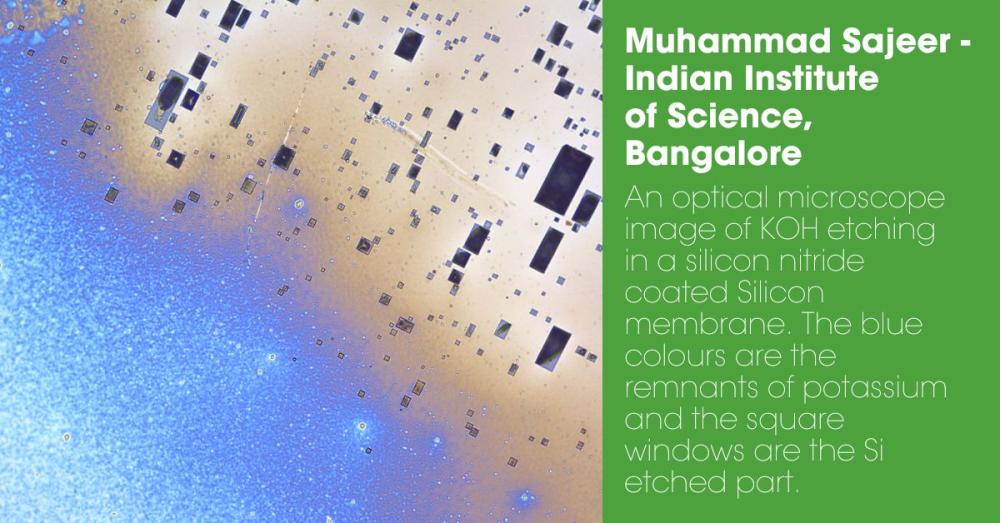 - An optical microscope image of KOH etching in a silicon nitride coated Silicon membrane. The blue colours are the remnants of potassium and the square windows are the Si etched part. Submitted by Muhammad Sajeer of the Indian Institute of Science, Bangalore.
