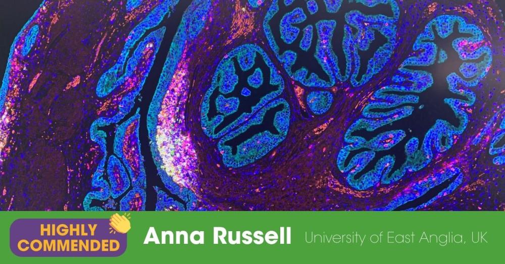 We were amazed by this beautiful image submitted by Anna Russell of the Norwich Medical School, University of East Anglia, UK. The incredible visual shows a cross section of a prostate under the microscope that has been stained with fluorescent markers to detect the presence of cancer (Cyan) and the subsequent influx of immune cells including T cells, B cells and Natural Killer cells (Yellow, Green, Pink and Orange). Anna and her colleagues use these images to detect the areas of higher immune cell activity in the prostate cancer and match them to the areas of the prostate cancer that are also positive for novel bacterial species, discovered by their lab, that are associated with more aggressive prostate cancer.