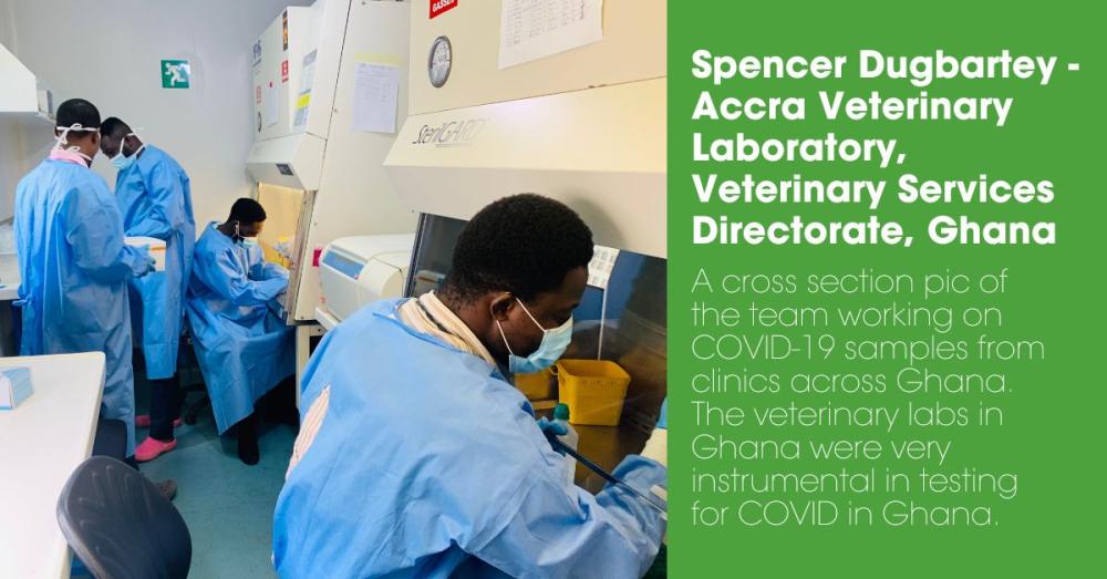 - A cross section pic of the team working on COVID-19 samples from clinics across Ghana. The veterinary labs in Ghana were very instrumental in testing for COVID in Ghana. Submitted by Spencer Dugbartey of Accra Veterinary Laboratory, Veterinary Services Directorate, Ghana.