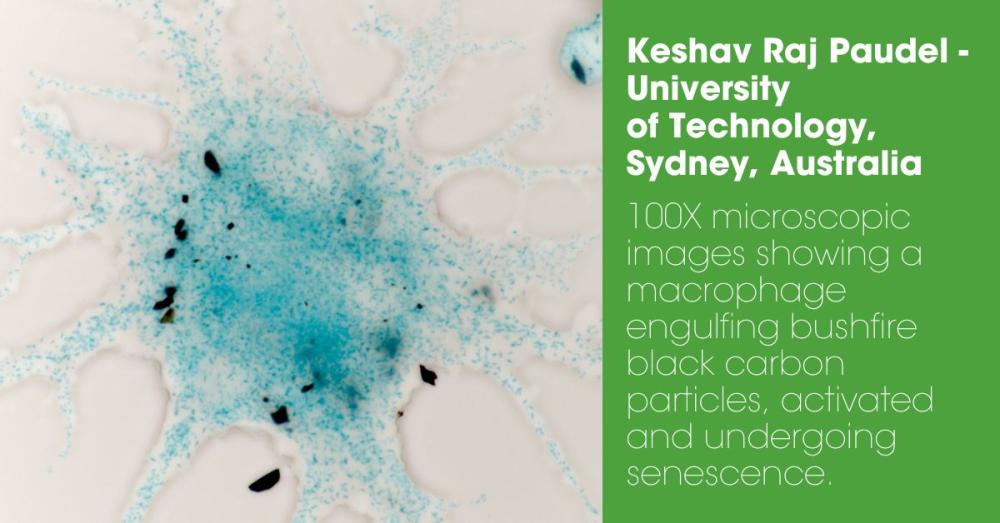 - 100X microscopic images showing a macrophage engulfing bushfire black carbon particles, activated and undergoing senescence. Submitted by Keshav Raj Paudel of the University of Technology Sydney, Australia.