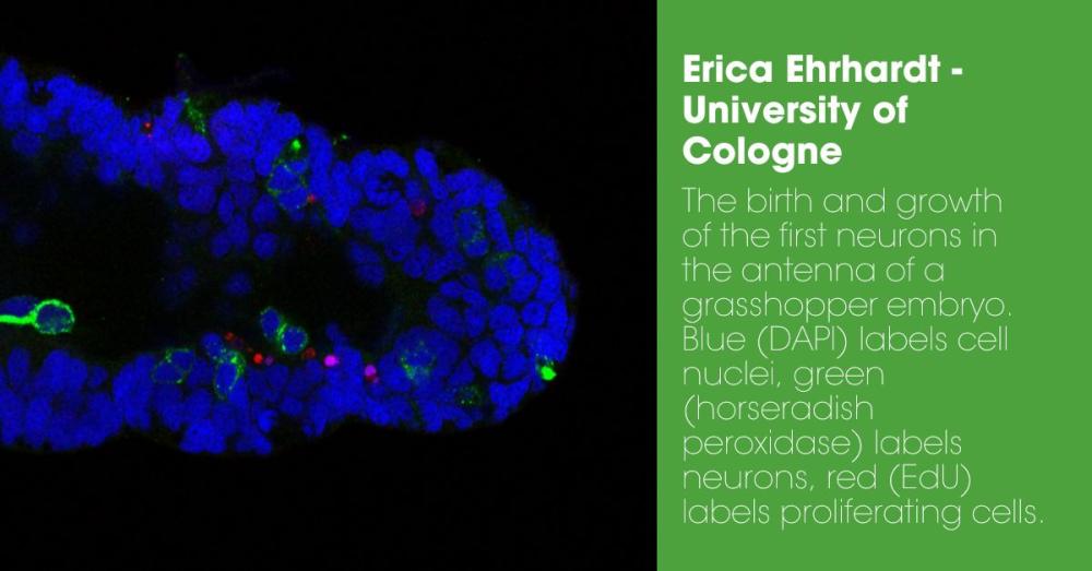 - The birth and growth of the first neurons in the antenna of a grasshopper embryo. Blue (DAPI) labels cell nuclei, green (horseradish peroxidase) labels neurons, red (EdU) labels proliferating cells. Submitted by Erica Ehrhardt of the University of Cologne, Germany.
