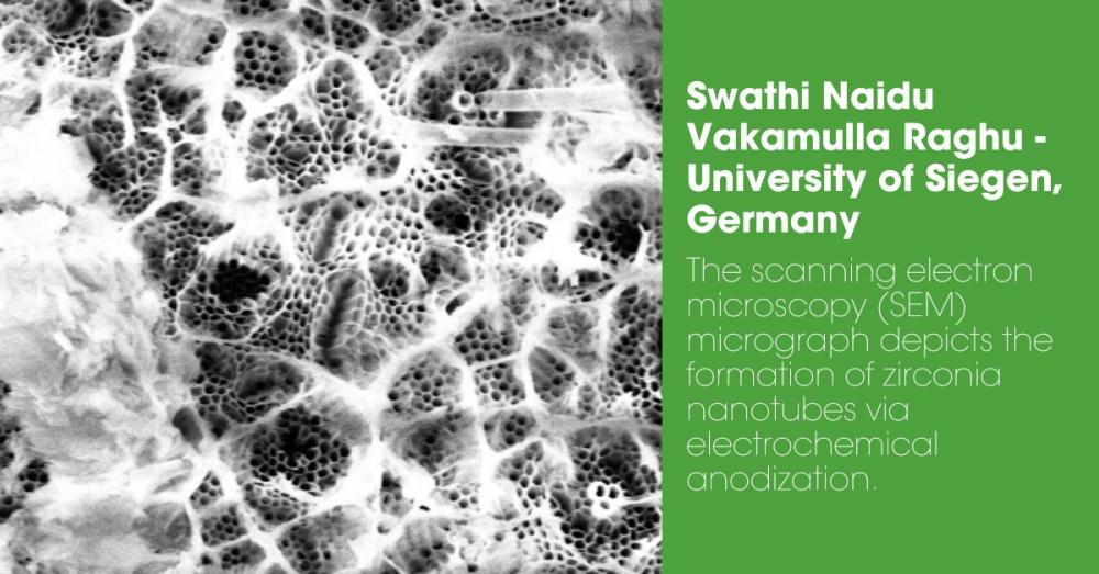 - The scanning electron microscopy (SEM) micrograph depicts the formation of zirconia nanotubes via electrochemical anodization. Submitted by Swathi Naidu Vakamulla Raghu of the University of Siegen, Germany.