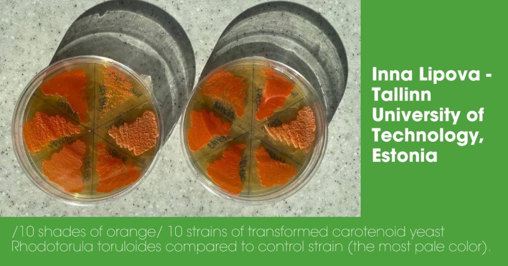 - /10 shades of orange/ 10 strains of transformed carotenoid yeast Rhodotorula toruloides compared to control strain (the most pale color). Submitted by Inna Lipova of the Tallinn University of Technology, Estonia.