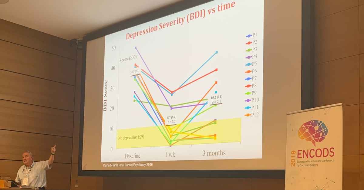Here’s the results of one study David shared, by Carhart-Harris et al in 2016, showing the improvement of patients with severe depression after 3 months: