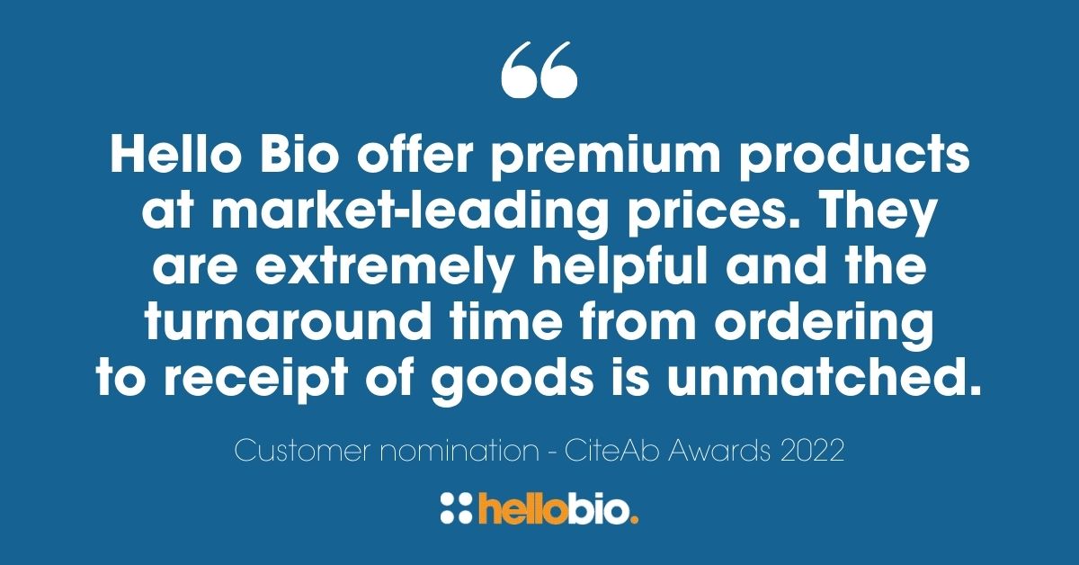 We’re proud to announce that Hello Bio has been Highly Commended once again in the 2022 CiteAb Awards! It’s the second year in a row that we have received the accolade in the prestigious ‘Researchers’ Choice’ category which celebrates the very best suppliers and individuals in the research reagent sector worldwide. The category is particularly special as nominations are made by scientific researchers around the globe who trust and value our quality products and outstanding customer service.