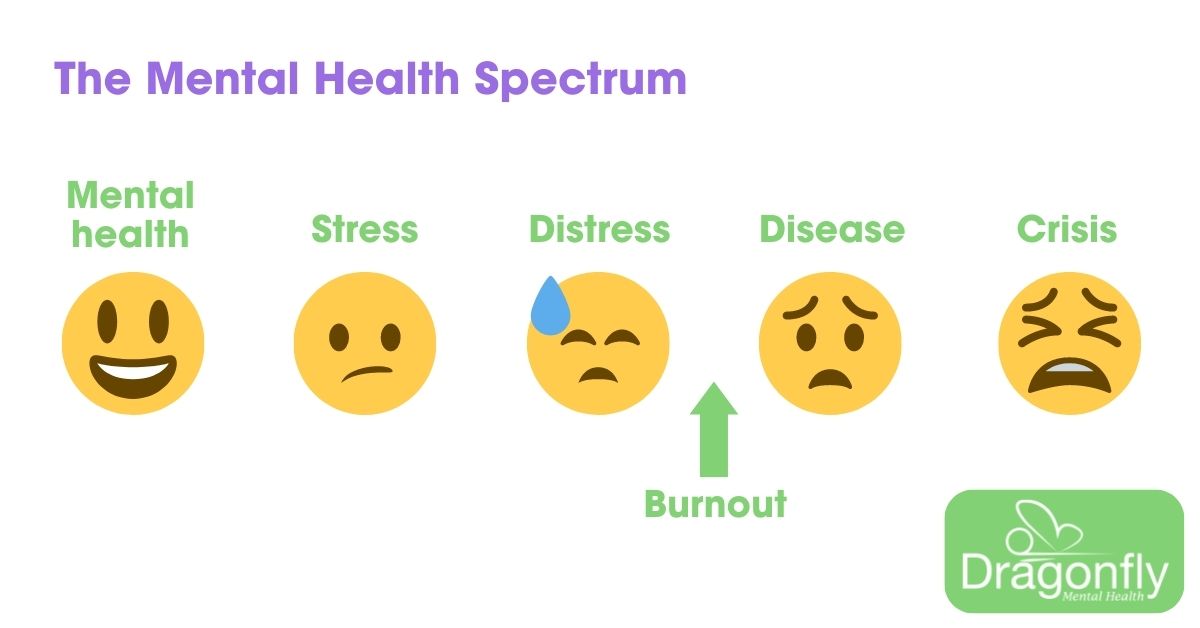 When things are going well, we are striving and thriving, performing and feeling our best. However, when stress is introduced to our lives, the way we continue to function very much depends on how we manage this stress. If levels of stress have been building up for some time, it’s likely we’ll soon reach a point of distress which can affect our appetite and sleeping patterns. If these symptoms are ignored we may move from distress to disease, or if these symptoms are related to our work we may also experience burnout. Ignoring our mental health may increase the risk of getting depression, and in the most extreme cases, to thoughts of suicide.