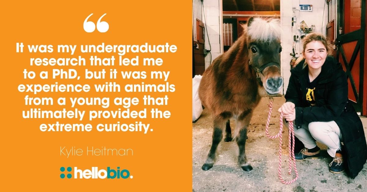 The reason I'm a scientist is because of my interest in animals and especially horses while growing up. My dad is a small animal veterinarian, and I would run around the clinic with my yellow stool so I could sit high enough to see my dad perform animal surgeries - it was my favorite activity. Furthermore, I am one of those weird horse girls and am so fortunate to have been able to grow up in a barn where I saw many joint supplements, skin supplements, hoof supplements, vitamins, electrolytes being advertised to improve the health of a horse, and that made me so interested in how these things work (or don't work). Ultimately, this concept is what inspired a research project that I carried out as an undergraduate and published in the Journal of Equine Veterinary Medicine. It was my undergraduate research that led me to a PhD, but it was my experience with animals from a young age that ultimately provided the extreme curiosity.