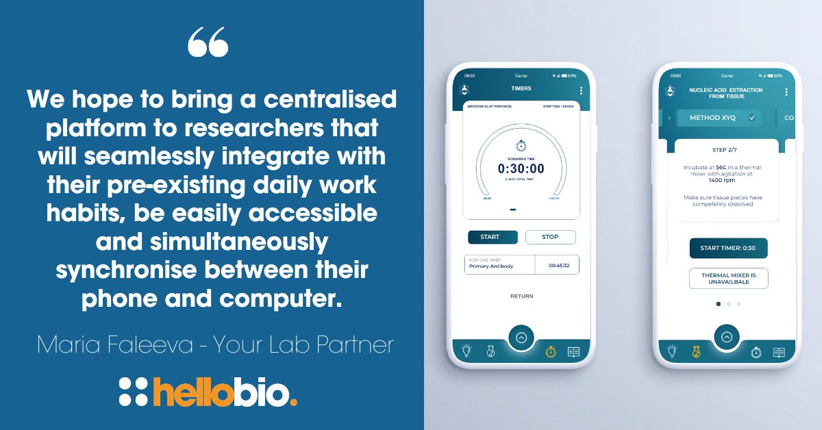 The initial idea for the development of Your Lab Partner came to me after realising how much time is wasted in the lab scouring the internet for methods and materials. I saw a gap between what was clearly needed and what was available out there. The more I thought about it, the more the idea grew and developed in my mind. I wanted to create a centralised platform for researchers that they could turn to to address their everyday problems in the lab, whether it be having unlimited stopwatches, or having access to a novel protocol right at your fingertips.