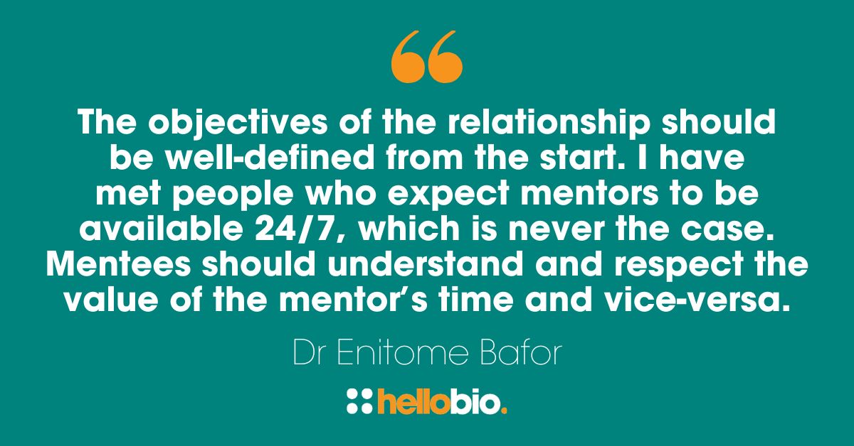Mentors should equally understand that being a mentor takes time, and as much as they want to, they cannot mentor everyone who comes their way. I have been guilty of that, and I learned the hard way. As a mentor, it is tempting to want to take in everyone who reaches out to you, particularly when the people seeking you out are minorities. However, when mentors take on more mentees than they can handle, they stretch themselves too thin and end up doing more harm than good and risk unpleasant fallout.