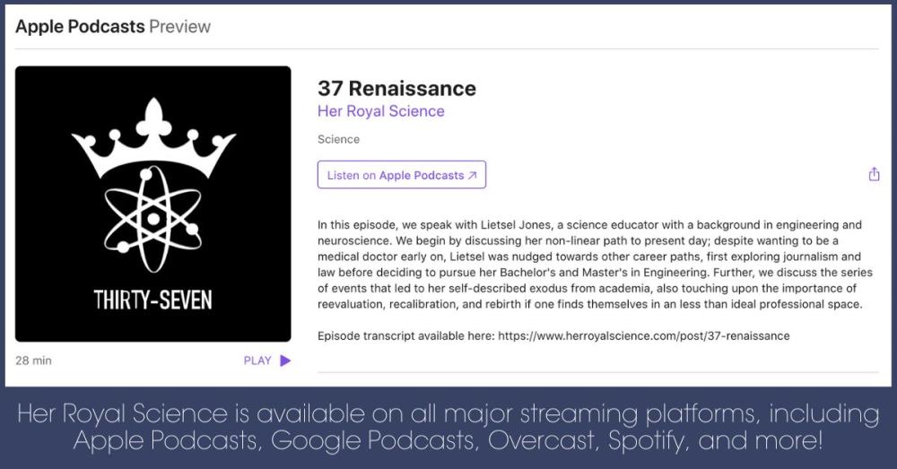 In Renaissance (Season 4, Episode 7), Lietsel Jones and I discuss the series of events that led to her self-described exodus from academia, also touching upon the importance of re-evaluation, recalibration, and rebirth if one finds themselves in a less than ideal professional space. Her story is especially moving because of how candid she was throughout our chat, and I am forever appreciative to Lietsel for sharing her story with me. Check it out here: https://www.herroyalscience.com/post/37-renaissance