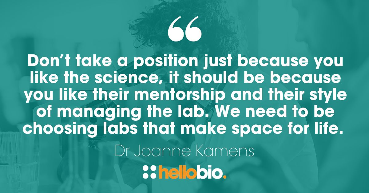 Something I hear often from scientists is that they’ve chosen a lab with advisors that have no understanding of work/life negotiation. In the old days, and it’s still prominent as a common structure today, the PI is often a man who has a partner at home who's taking care of the household. This domestic arrangement allows him to work all the hours that he wants. If you have a PI like that who is not embracing an understanding of a more reasonable work/life negotiation, it’s going to be difficult for you to prioritise your personal life over your work. Think hard about making good choices and do your research before you choose an advisor. Gather data. Don’t take a position just because you like the science, it should be because you like their mentorship and their style of managing the lab. We need to be choosing labs that make space for life.