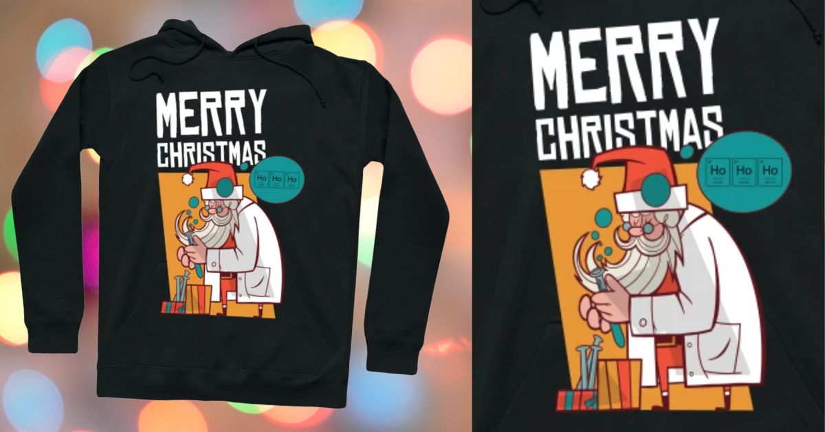 This fun Christmas hoodie finds a cartoon Santa busy at work in the science lab! Mixing up some Christmas magic for scientists everywhere, this great design by madeinchorley on TeePublic is a cool fashion option for the holiday season.