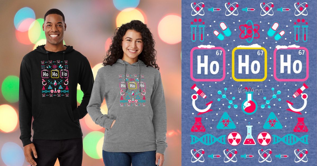 This fantastic Christmas sweater borrows the chemical element of holmium (three times!) from the periodic table to help spell out Santa’s famous catchphrase! This great design from KsuAnn on RedBubble is available in a selection of colours as both a hoodie or a t-shirt.