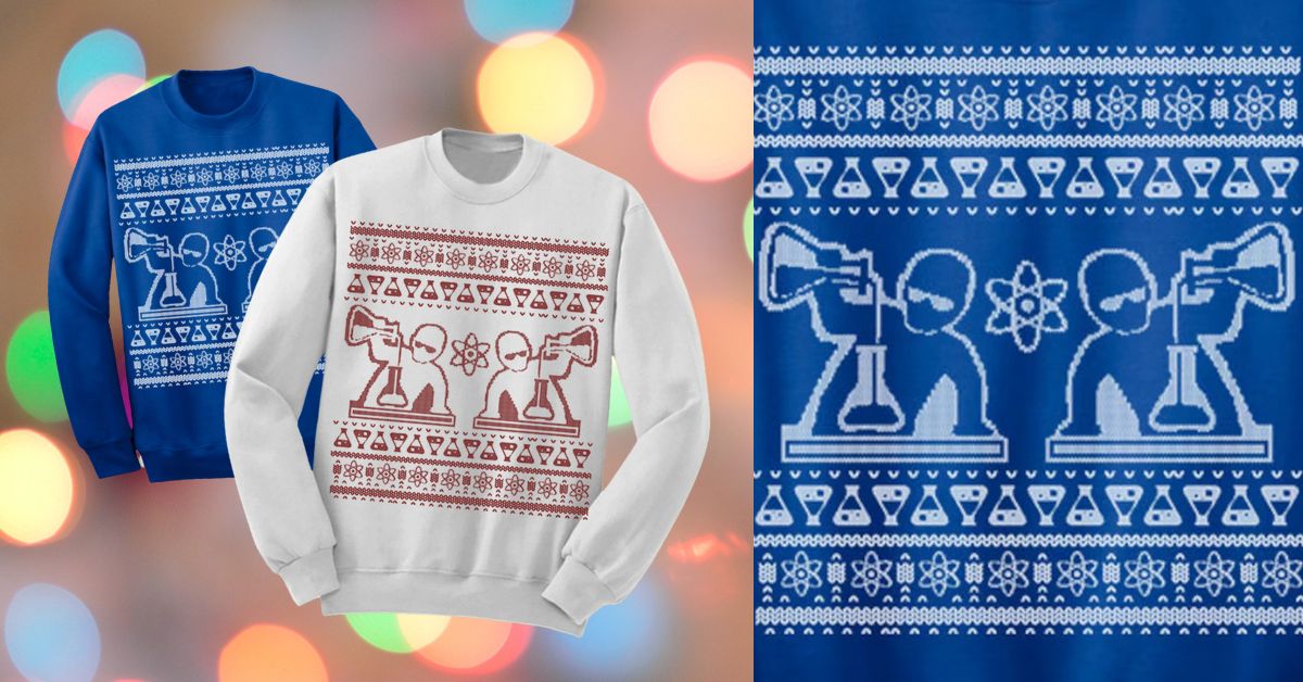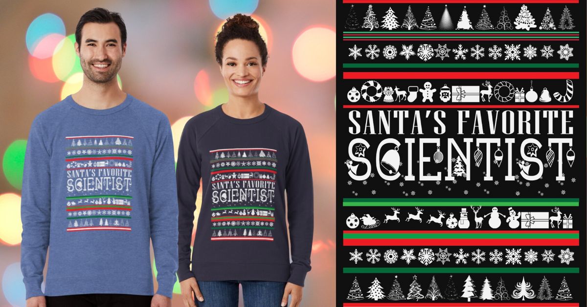 This simple but classic Christmas jumper design features two scientists hard at work in the lab this holiday season! Available in a variety of colours including a cool white, this great design by the ChristmasSweatersCo on Etsy is a nice gift idea for the busy researcher in your life.