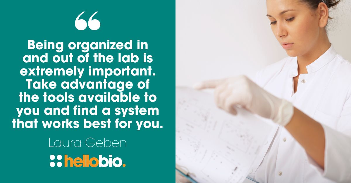Good organisational skills are especially important if you have additional commitments outside of your day-to-day lab work, such as writing a thesis or parenting responsibilities. Putting plans and processes in place from day one will help you stick to a routine and ensure that the things that are important to you don’t slip down your priority list.