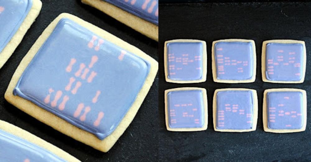 First is a simple yet effective idea from the notsohumblepie blog. All you need is an easy sugar cookie recipe and some royal icing, and you can decorate your biscuit tops with DNA fragments! You'll need a steady hand to pipe the pink markers onto the part-set purple icing, but the result can be very effective. If you really want to impress your lab colleagues, why not try to replicate the patterns of their own microbiology gels!