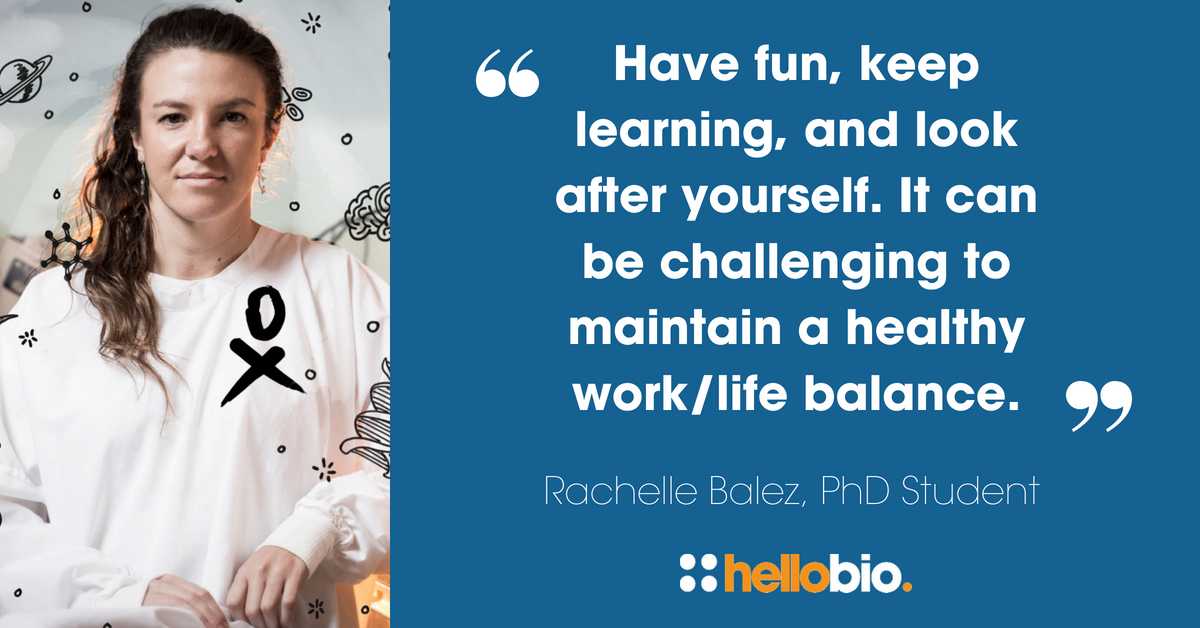Remember to have fun, keep learning and to look after yourself – it can be challenging to maintain a healthy work/life balance at times.Rachelle Balez