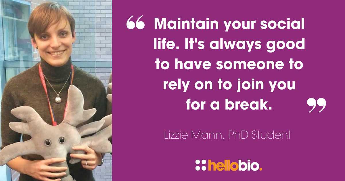 Maintain your social life – it’s always good to have someone you can rely on to join you for a break when things go badly in the lab.Lizzie Mann