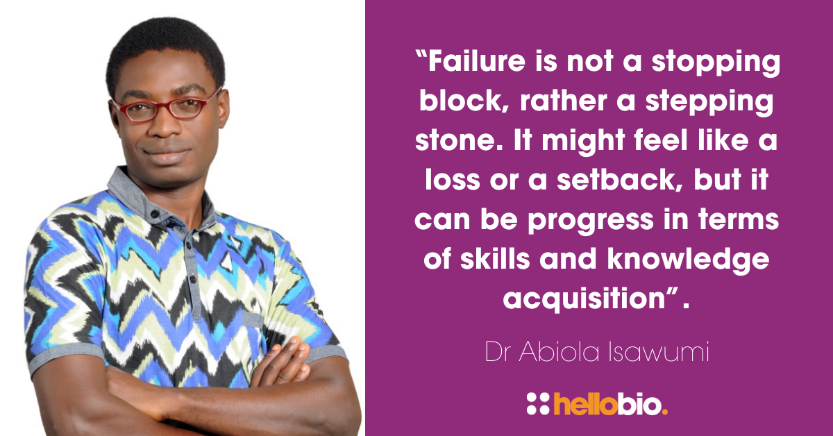 “Resilience is essential… failure is not a stopping block, rather a stepping stone. Failure doesn’t mean you have to give up on any of your research dreams. Though it might feel like a loss or a setback, it can be progress in terms of skills and knowledge acquisition.” – Dr Abiola Isawumi