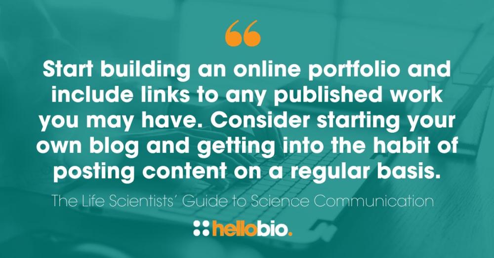 Build up a strong online presence to promote yourself and your work. Consider creating your own website where you can post examples of your scicomm work. Start building an online portfolio and include links to any published work you already have, which could include newspaper articles or blog pieces. If you want to get into science writing, start your own blog and get into the habit of posting something on a regular basis, eg. daily or weekly. If you prefer to communicate via public speaking, share videos clips of any talks or presentations you have given, podcast or video interviews, and TV or radio appearances.