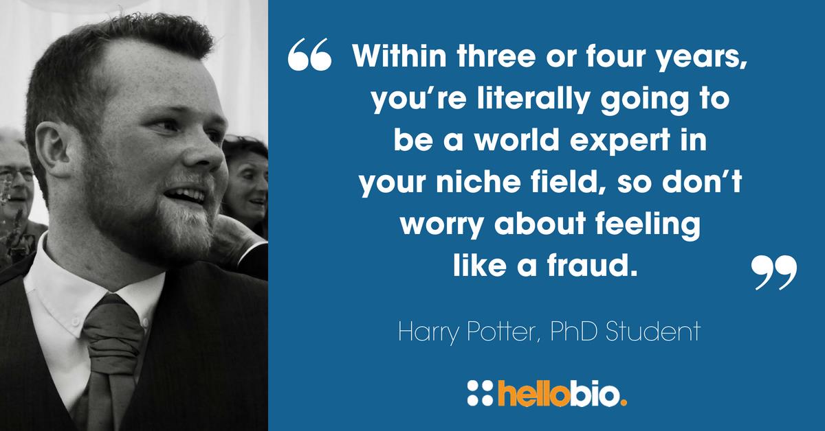 “In my first week I went to a talk about life as a PhD student and I was introduced to the concept of impostor syndrome. Nothing has resonated with me more,” says PhD student Harry Potter. But remember, he says, “Within three or four years, you’re literally going to be a world expert in your niche field, so don’t worry about feeling like a fraud. Ask the really basic questions, go to the talks where you feel out of your depth, and be content knowing that you don’t need to know everything. Soon enough you’ll gain the confidence to talk about your subject like a pro.”