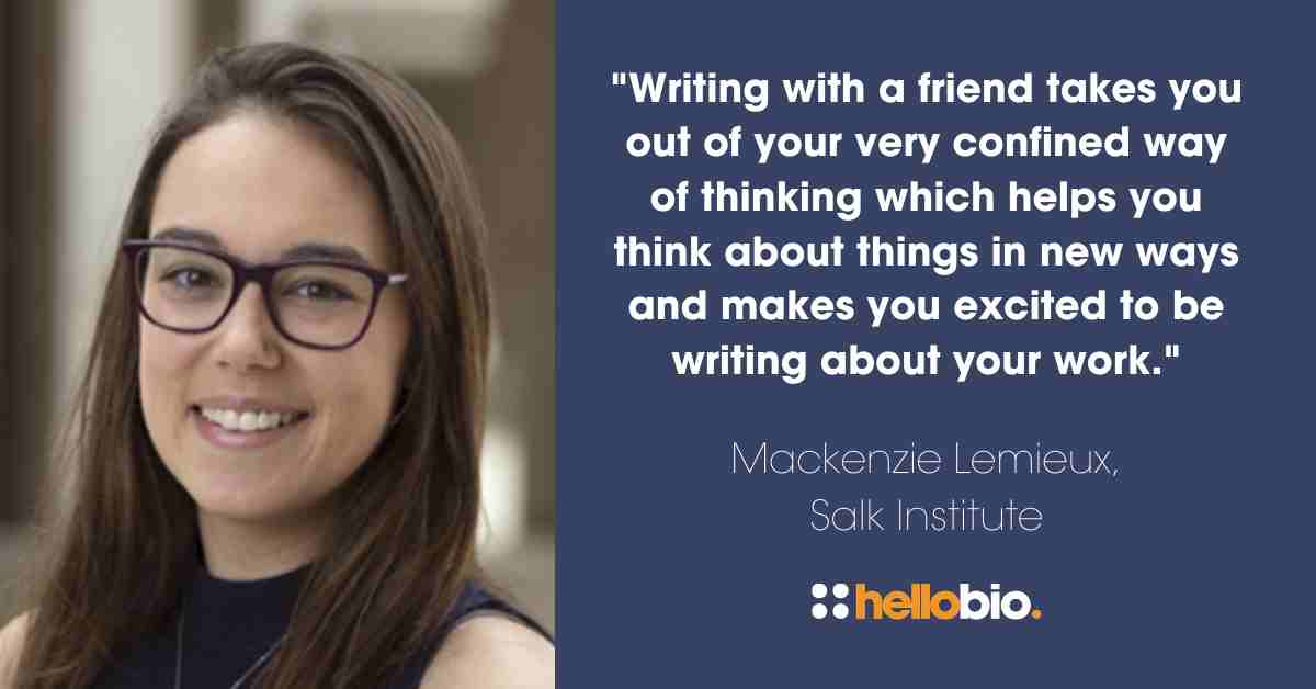 MacKenzie Lemieux, research technician in the Tye Lab at the Salk Institute for Biological Studies, agrees that writing with a friend is an effective habit to get into. She says: “It takes you out of your very confined way of thinking which helps you think about things in new ways and makes you excited to be writing about your work (hopefully).”