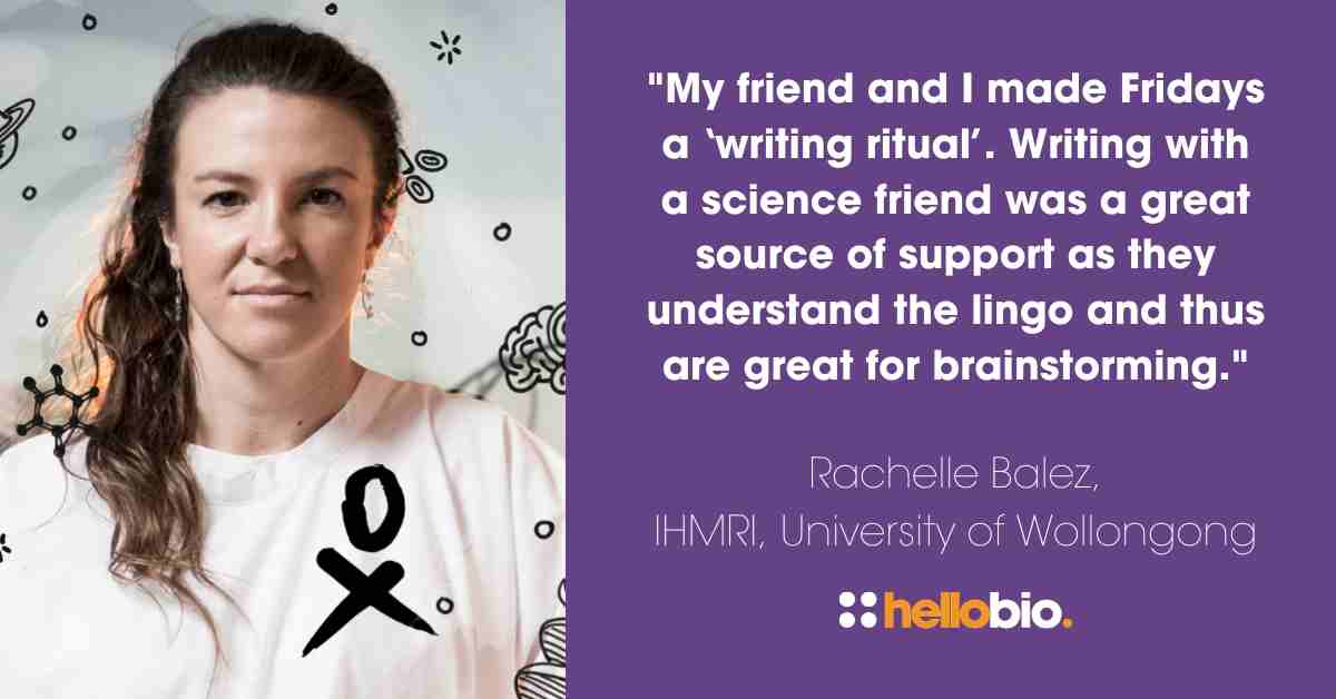 Rachelle Balez, Neuroscientist and Stem Cell Biologist at Illawarra Health and Medical Research Institute suggests writing with a fellow scientist for moral support and to keep you focused. She told us: “My friend and I made Fridays a ‘writing ritual’. We would go to a nice cafe for breakfast, then write together for a couple of hours, have lunch and a break, write for another couple of hours then follow up with a swim/walk to debrief. I know this isn’t practical or possible for everyone, but it helped me to break feeling overwhelmed by writing to it being the highlight of my week. Writing with a science friend was a great source of support as they understand the lingo and thus are great for brainstorming.”
