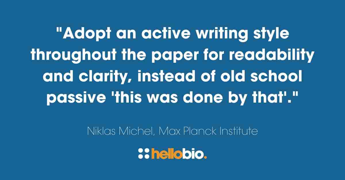 Neuroscience PhD graduate Niklas Michel adds: “Make the title a snappy, active and direct statement summarizing the finding, like ‘this does that’. Avoid vague words like ‘characterization’, ‘identifying’, etc. Apply that principle to section titles too. Adopt an active writing style throughout the paper for readability and clarity, instead of old school passive ‘this was done by that.’”