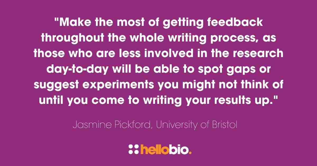 In her guest blog for us, Research Associate at the University of Bristol, Jasmine Pickford recommends getting feedback from peers and colleagues throughout the writing process – not just at the end. She says: “Those who are less involved in the research day-to-day will be able to spot gaps or suggest experiments you might not think of until you come to writing your results up – and you wish you’d have thought of before.”