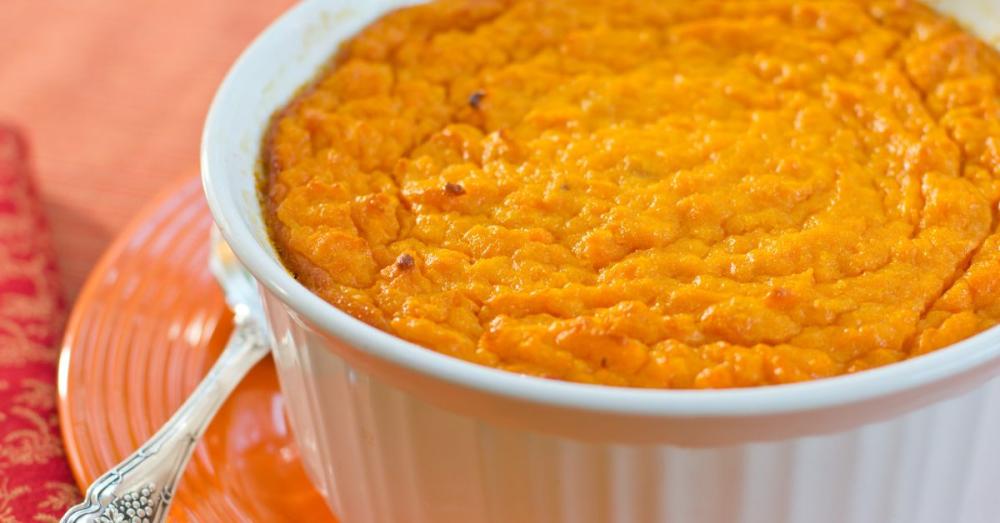 Pictured: A classic sweet potato soufflé which can be topped with warm spices such as cinnamon and nutmeg