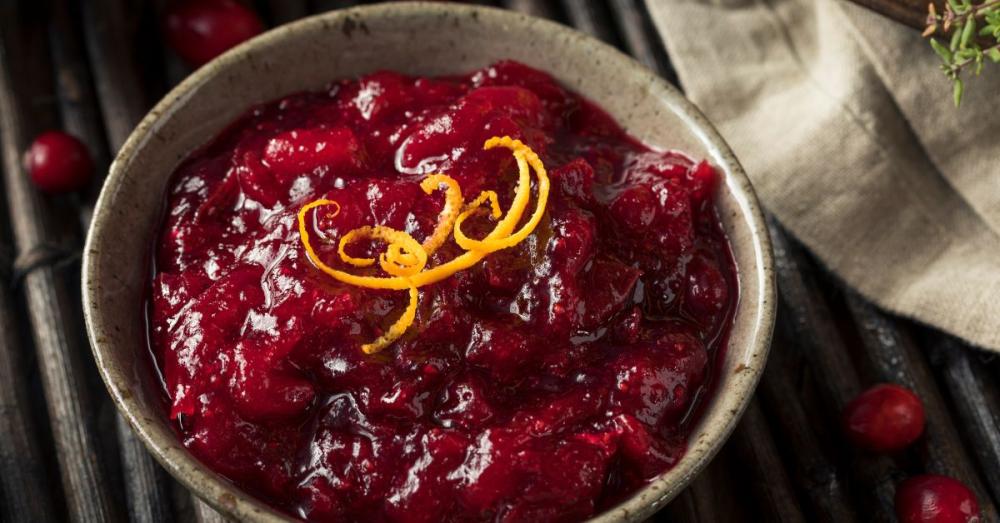 Pictured: A vibrant cranberry sauce garnished with orange peelings