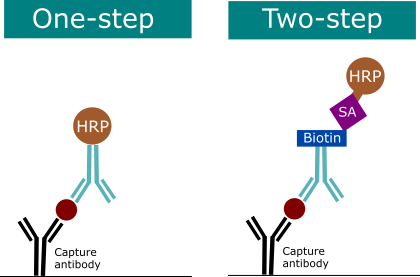 - One-step detection uses a HRP conjugated detection antibody. Some applications may benefit from this due to the slightly reduced sensitivity due to high abundance of analyte of interest in the sample.