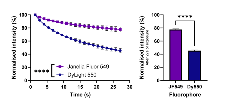 Figure 2. Superior anti-fade performance of Janelia Fluor® 549 conjugated dyes compared to those conjugated with DyLight 550 fluorophores. |