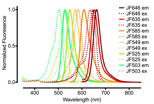 Figure 1. Absorption and emission spectra of Janelia Fluor® dyes. Adapted from Janelia Research Campus [2]. |