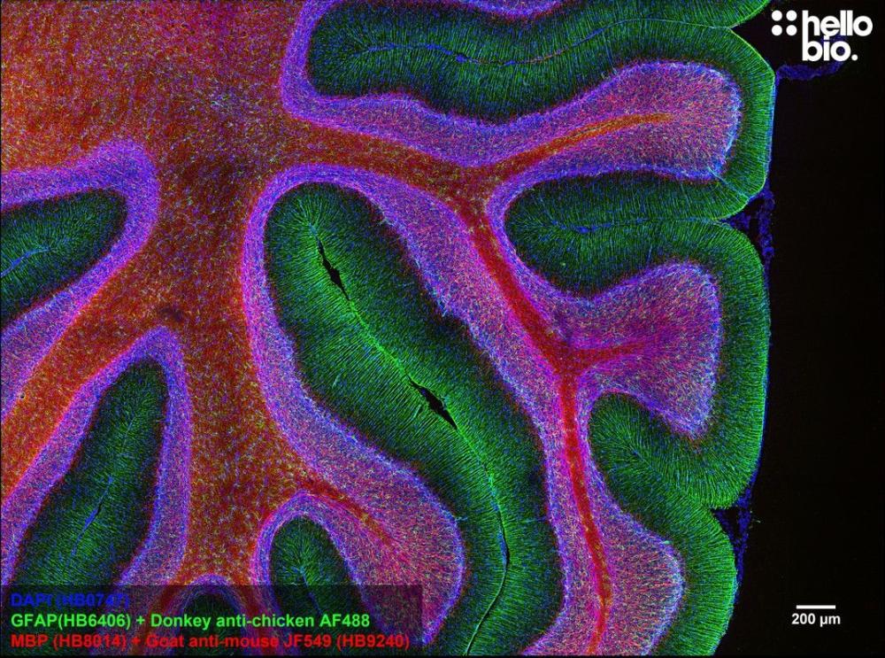 Figure 3. MBP staining in rat cerebellum using Goat Anti-Mouse IgG H&L Janelia Fluor® 549 (HB9240) preadsorbed secondary antibody. |
